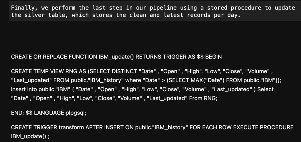 The last stage of the pipeline is carried out with a stored procedure that updates the silver table to persist daily, cleaned, and up-to-date records.